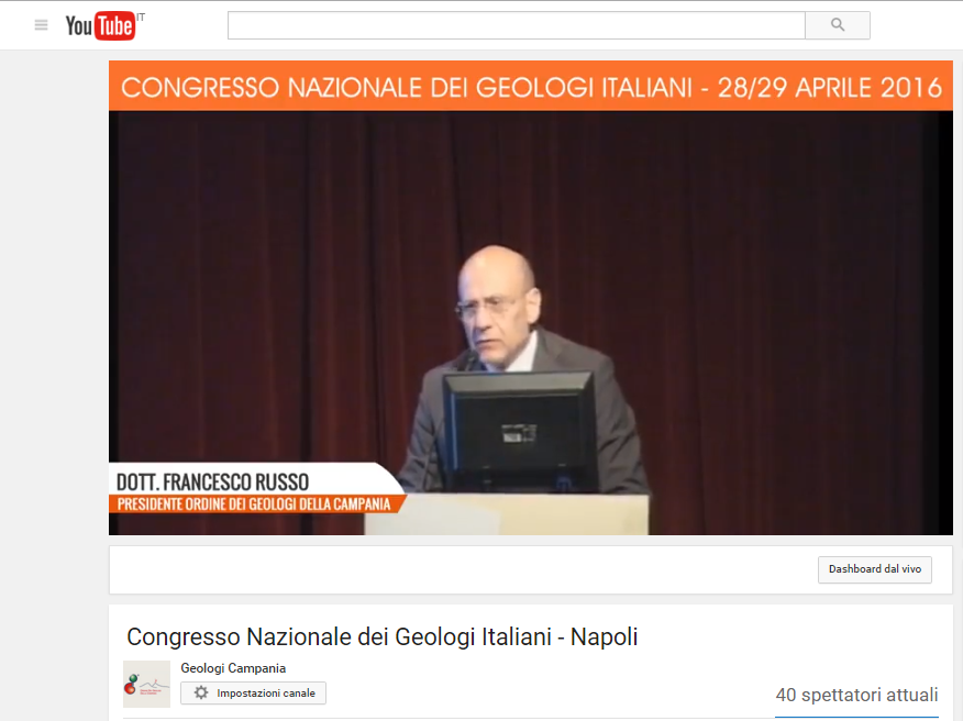 Il Congresso Nazionale dei Geologi Italiani è in diretta dalla sala congressi del Hotel Royal Continental di Napoli. La diretta streaming è sul sito www.geologicampania.it e su canale YouTube dell’Ordine dei Geologi della Campania.