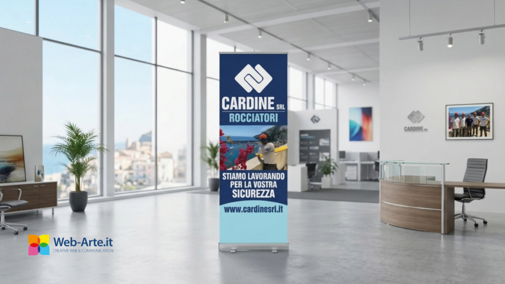 L’identità istituzionale di Cardine srl si proietta verso il futuro attraverso una nuova e potente sintesi visiva. Questo banner verticale, progettato con estrema cura dal team di Web-Arte.it, incarna il perfetto equilibrio tra un’estetica ricercata e un rigore professionale senza compromessi. Non si tratta di un semplice elemento espositivo, ma di un componente distintivo che, d’ora in avanti, avrà il compito di raccontare l’eccellenza e il valore profondo del brand in ogni contesto, dalle fiere di settore ai momenti di incontro istituzionale.